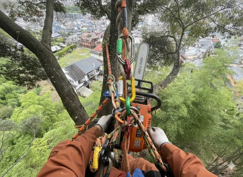 特殊伐採とは、木を根元から一気に倒すのではなく、作業員が木に登り、上部から枝や幹を少しずつ切り下ろしていく伐採方法です。ロープや安全装備を用いて切った木を制御しながら下ろすため、周囲に建物や電線がある環境でも対応できます。
